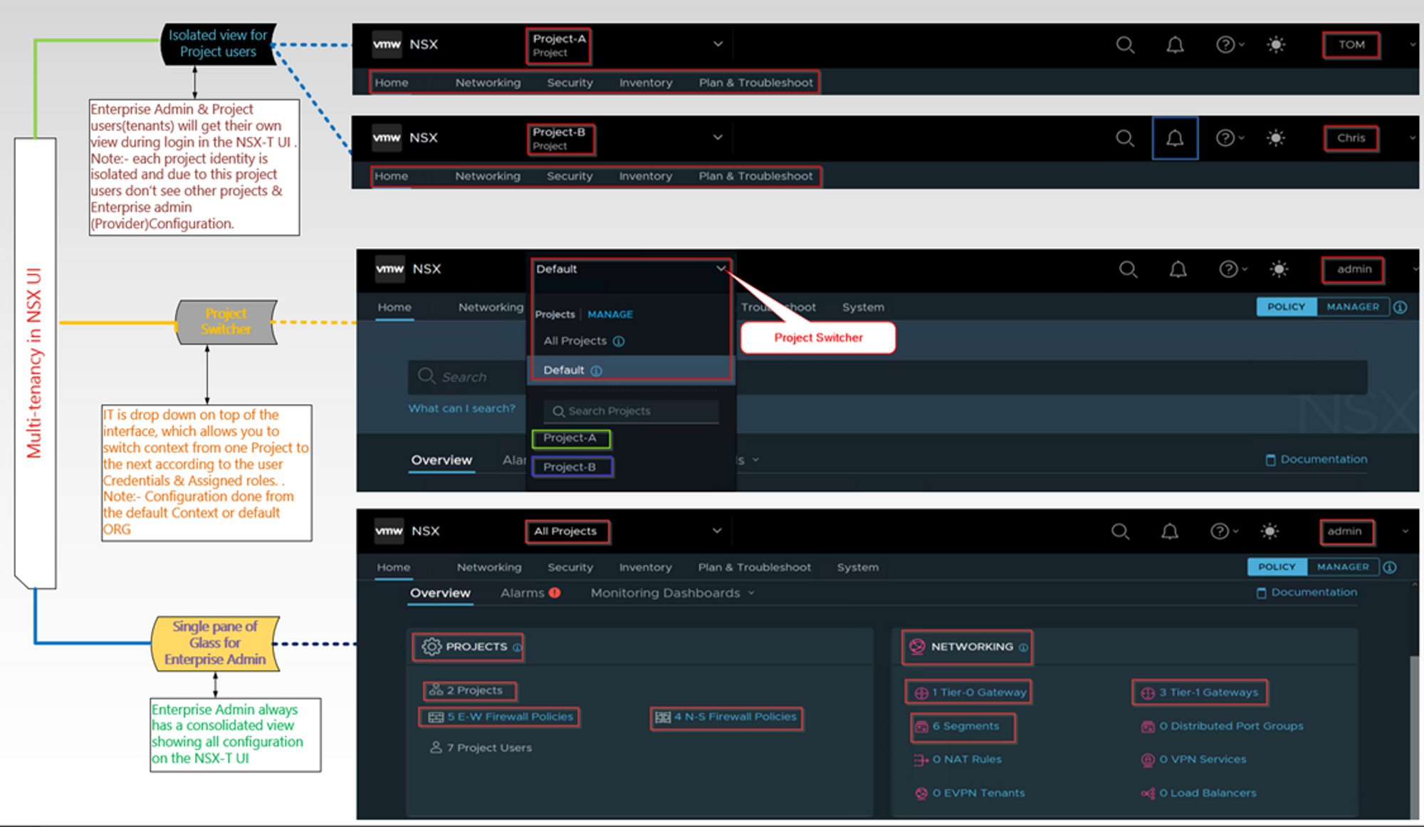 NSX 4.1.0 enables multi-tenancy consumption from the UI for the Enterprise Admin (Provider) and the Project users (Tenants).