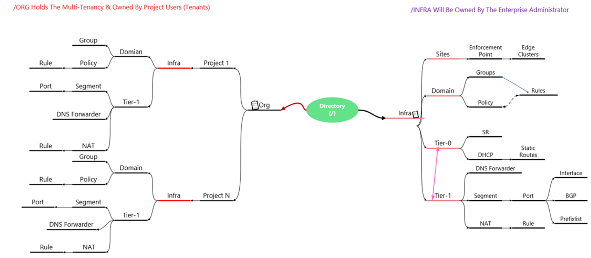 The NSX policy model follows a clear hierarchical structure that comprises two system-created branches: Infra and /org/default.