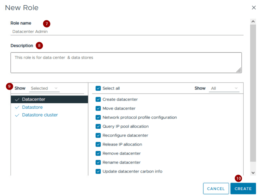 Step7: – Give the name of the role. In this example we are using Datacenter Admin
