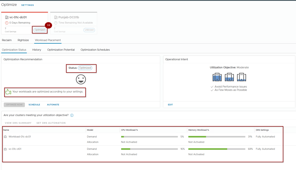 - Review the data center carousel. Any data center currently breaching its intent will be marked as “Not Optimized”.