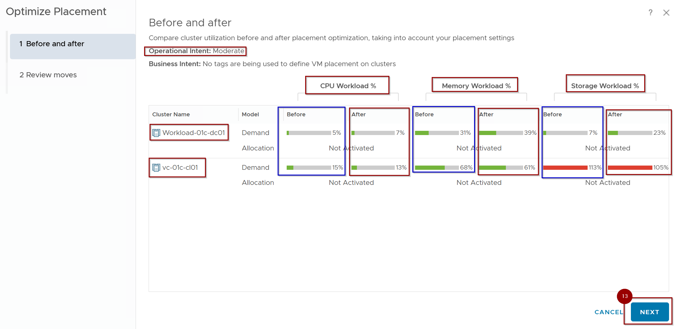 13. Review the Plan: The wizard will show the “Before” and “Projected After” utilization percentages across all three resource dimensions (CPU, Memory, Disk). Click on Next.