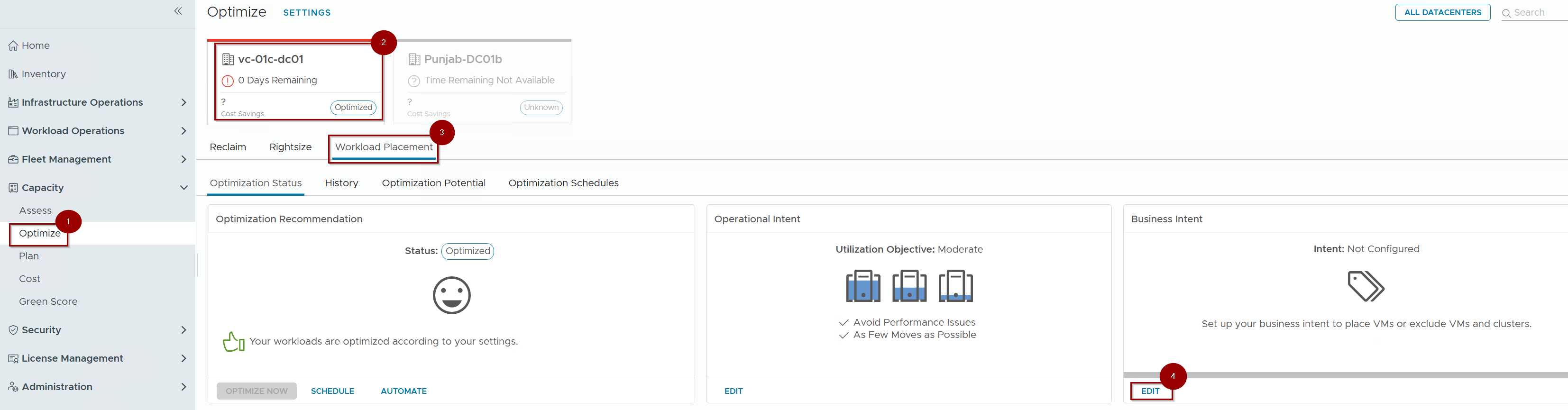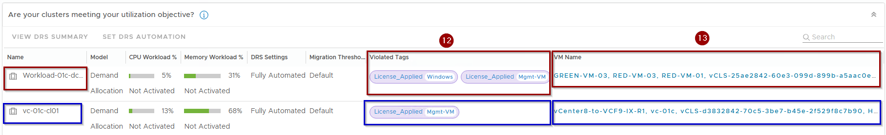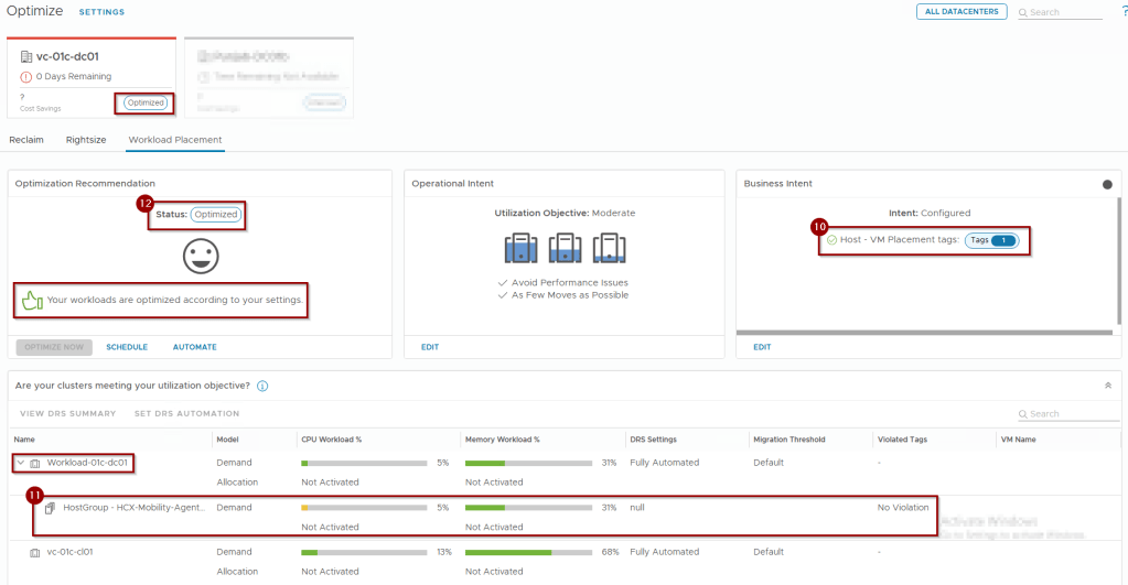 The placement engine continuously monitors the fleet for Tag Violations. A violation is flagged if a VM’s tags do not match the tags of its current Cluster or Host. This triggers a “Not Optimized” status, allowing the engine to recommend migrations that restore compliance with the defined business intent.