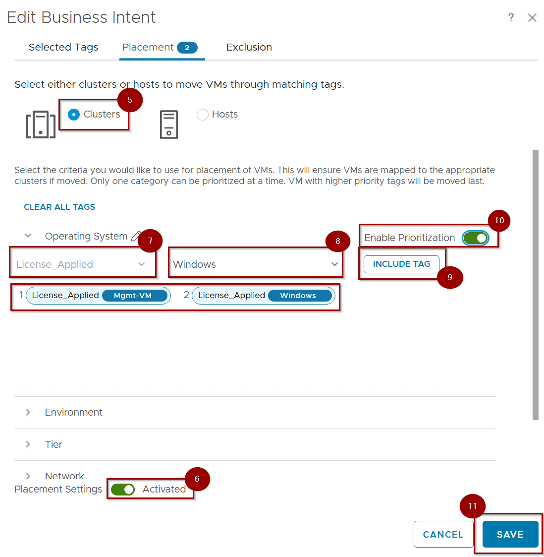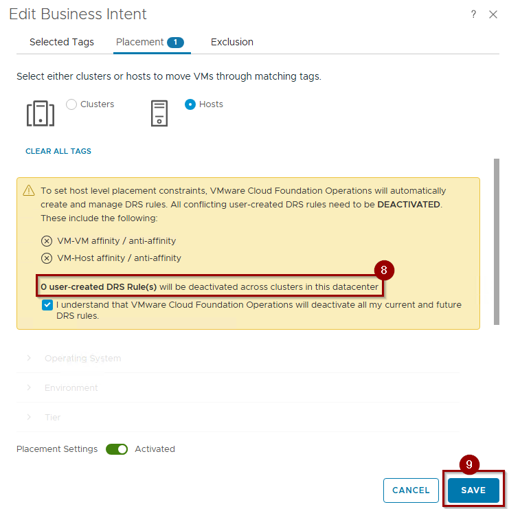 Note: – Step 3 is optional because Step 2 already specifies the business intent at the cluster level. If you prefer host-level placement over the cluster-level option, follow the steps below, as host-level placement will remove your cluster-level tags