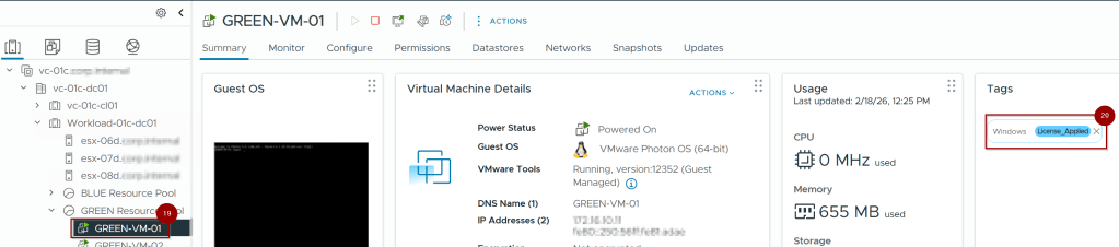 - Assign these tags to the specific Cluster and all associated Virtual Machines.