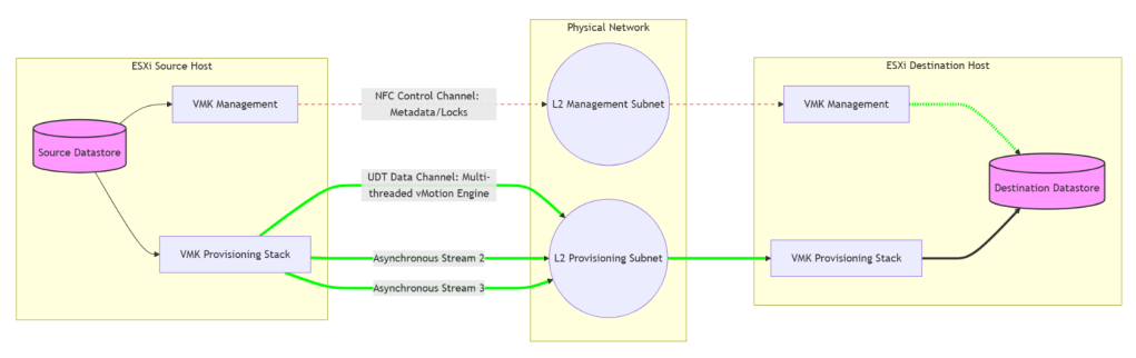 - The Result: By using the asynchronous, multi-threaded vMotion stack, data moves across parallel streams on the Provisioning Network, saturating high-speed links (25/100 GbE) and slashing migration times.
