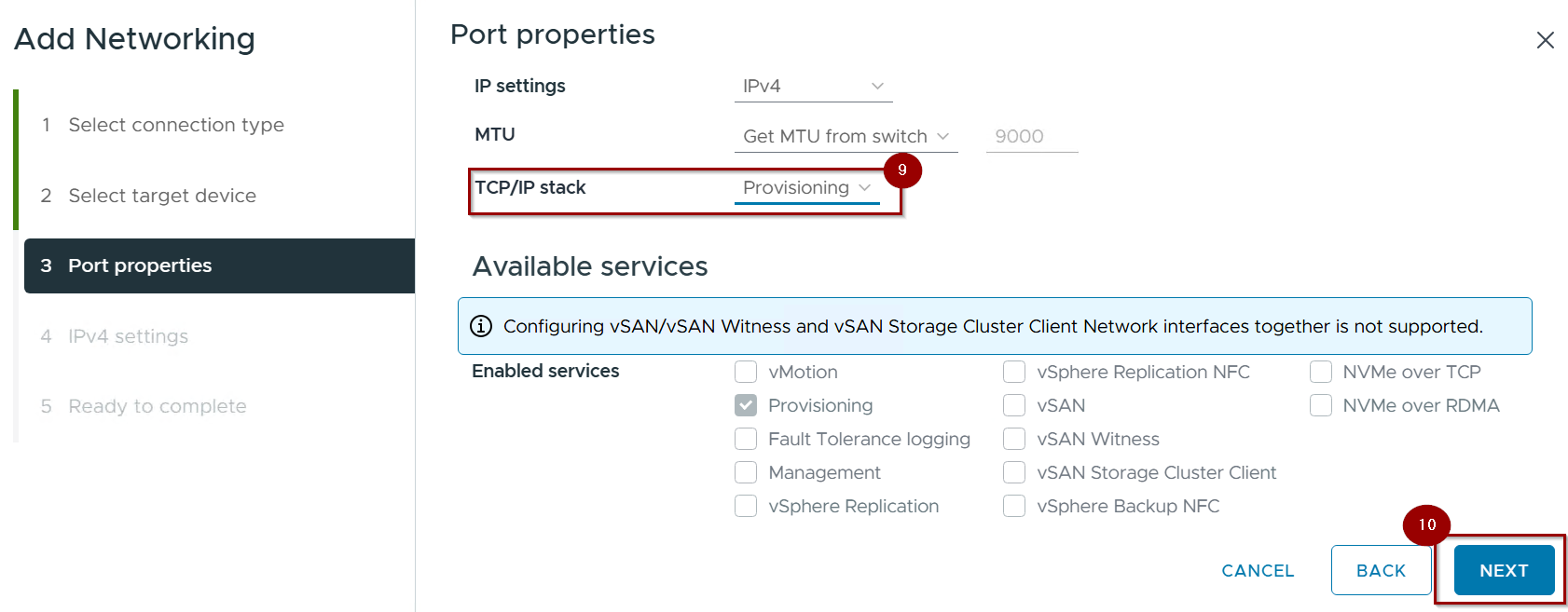 - MTU Consistency: If using Jumbo Frames (9000), it must be consistent across the vMotion and Provisioning VMKs.