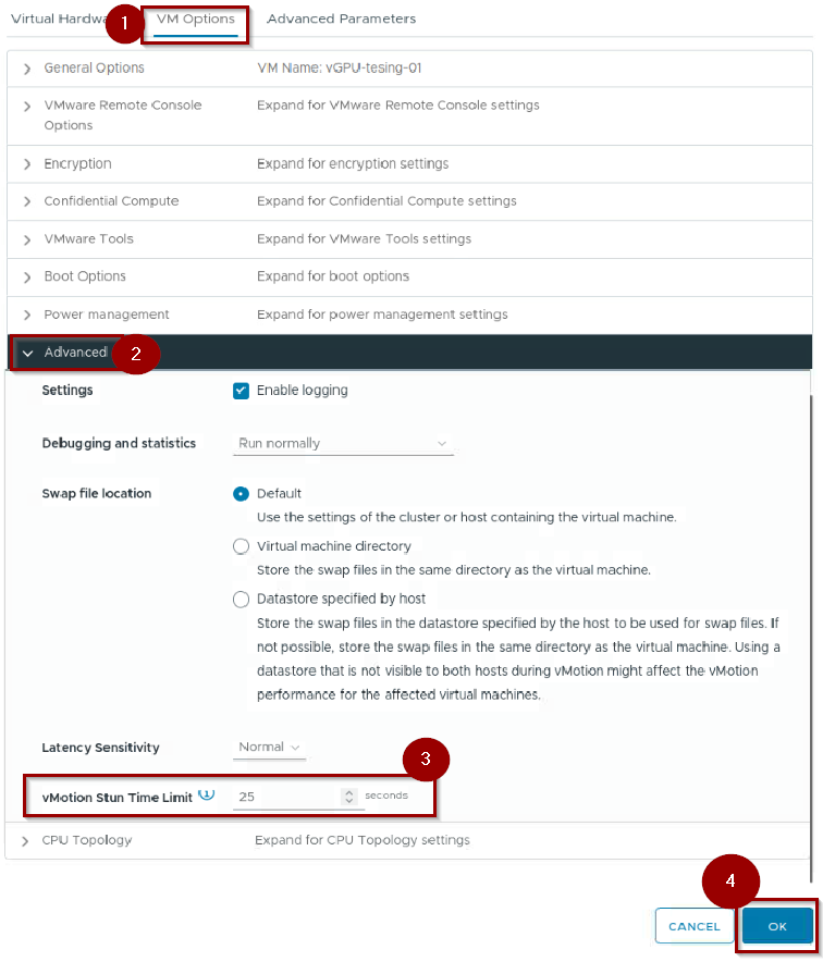 - The 100-Second Stun Limit: By default, vSphere allows a 100-second window for the “final stun.” While VCF 9’s engine minimizes this, for “Monster VMs” (>128GB VRAM), architects may need to manually adjust the vMotion Stun Time Limit in VM Advanced Options to allow for network variances during high-load periods.