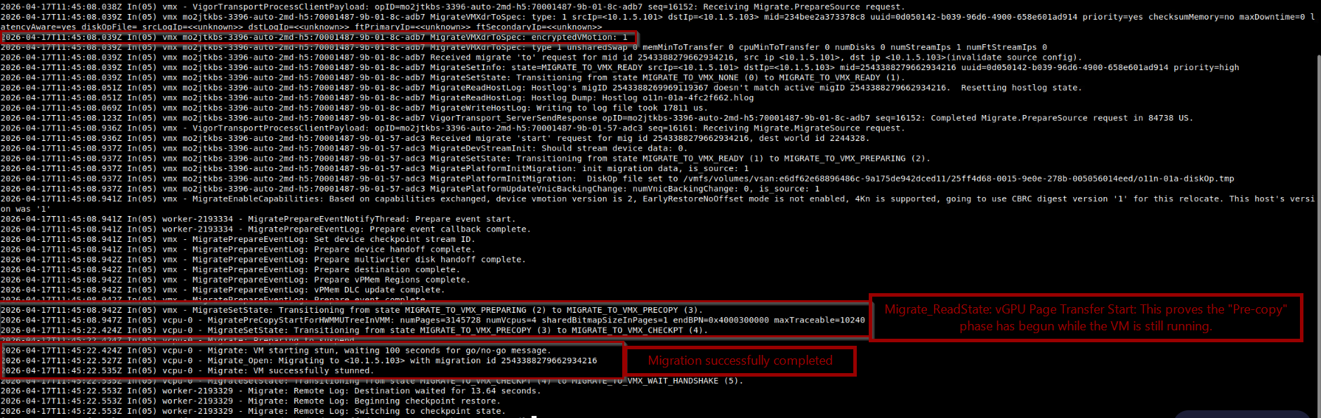 Migrate_ReadState: vGPU Page Transfer Start. - The Proof: Multiple iterations of this log entry indicate the “Liquid” iterative copy is active. A single entry would indicate a legacy, non-optimized migration.